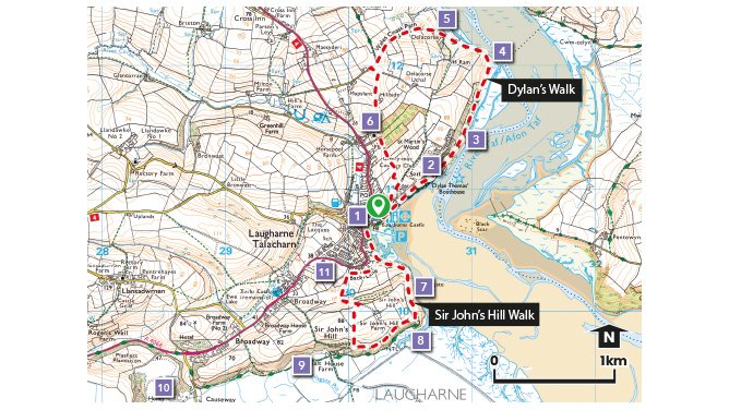 9. The Lees - Low-lying common land (40 small strips or shares) belonging to the Corporation of Laugharne, first granted by Sir Guy de Brian in 1291 and with cast-iron pillars marking the bounds.